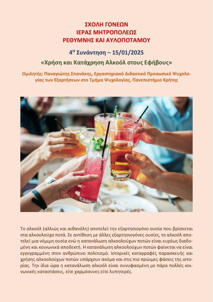 Η 4η Συνάντηση Σχολής Γονέων της Ιεράς Μητροπόλεως Ρεθύμνης και Αυλοποτάμου με θέμα «Χρήση και Κατάχρηση Αλκοόλ στους Εφήβους» θα πραγματοποιηθεί στις 15 Ιανουαρίου 2025.