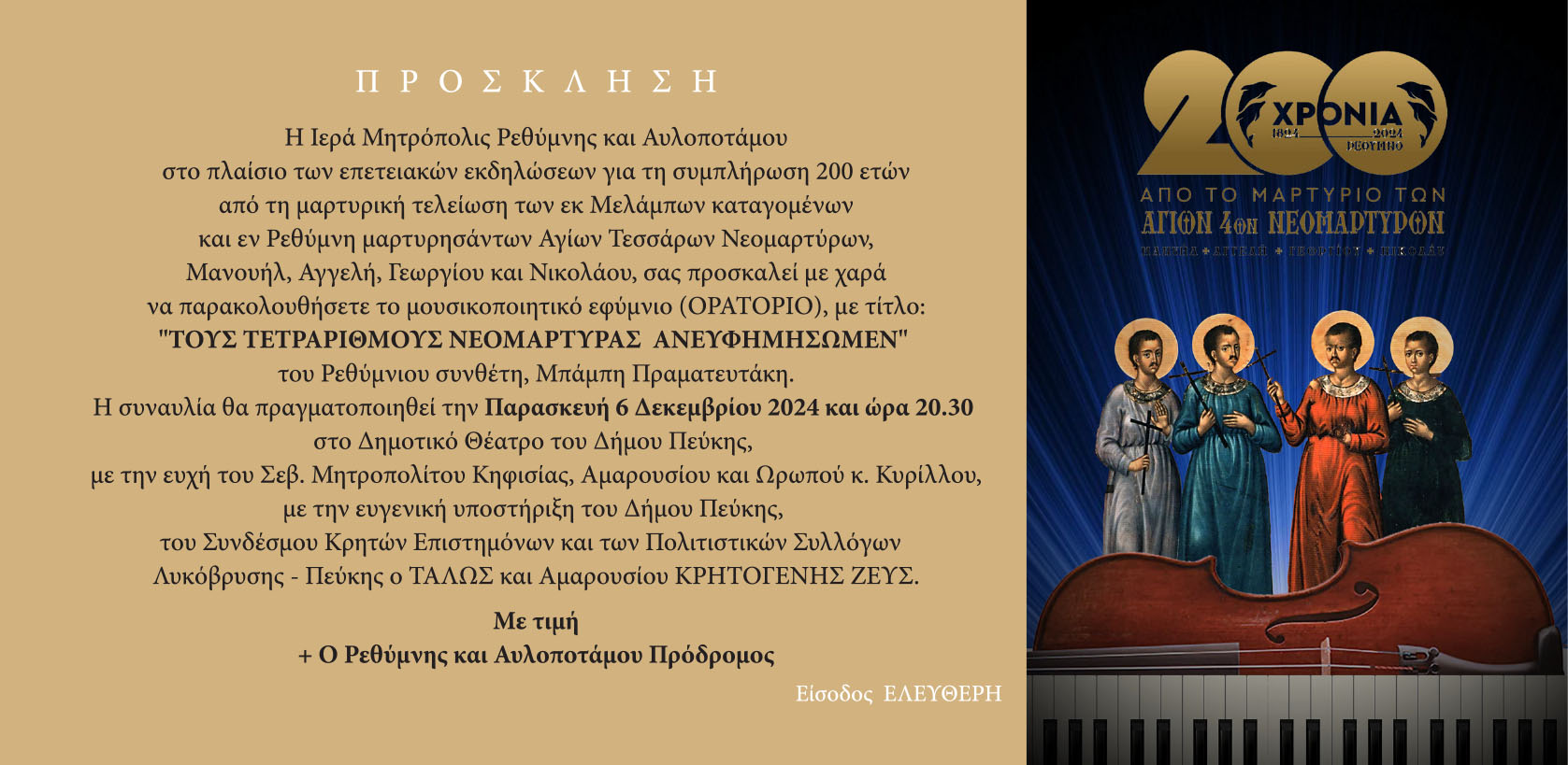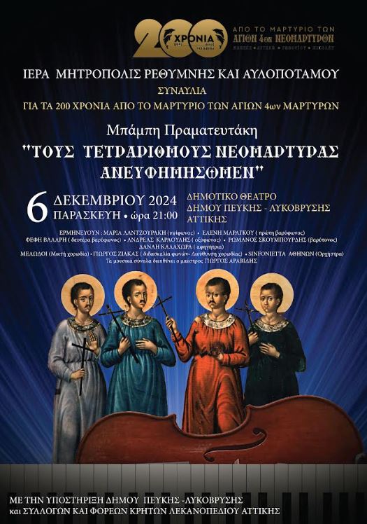 Η Ιερά Μητρόπολη Ρεθύμνης και Αυλοποτάμου, στο πλαίσιο των επετειακών εκδηλώσεων για τη συμπλήρωση 200 ετών από τη μαρτυρική τελείωση των εκ Μελάμπων καταγομένων και εν Ρεθύμνη μαρτυρησάντων Αγίων Τεσσάρων Νεομαρτύρων, Μανουήλ, Αγγελή, Γεωργίου και Νικολάου, προσκαλεί με χαρά στο μουσικοποιητικό εφύμνιο (ΟΡΑΤΟΡΙΟ), με τίτλο: “Τους τετραριθμους Νεομάρτυρας ανευφημησώμεν” του Ρεθύμνιου συνθέτη, Μπάμπη Πραματευτάκη.
