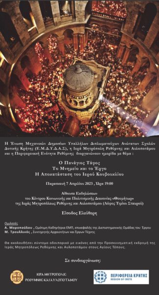 Η Ένωση Μηχανικών Δημοσίων Υπαλλήλων Διπλωματούχων Ανώτατων Σχολών (ΕΜΔΥΔΑΣ) Δυτικής Κρήτης σε συνεργασία με την Ιερά Μητρόπολη Ρεθύμνης και Αυλοποτάμου και την Περιφέρεια Κρήτης-Περιφερειακή Ενότητα Ρεθύμνης διοργανώνουν εσπερίδα με θέμα «Ο Πανάγιος Τάφος – Το Μνημείο και το Έργο – Η Αποκατάσταση του Ιερού Κουβουκλίου του Πανάγιου Τάφου στον Πανίερο Ναό της Αναστάσεως στα Ιεροσόλυμα».