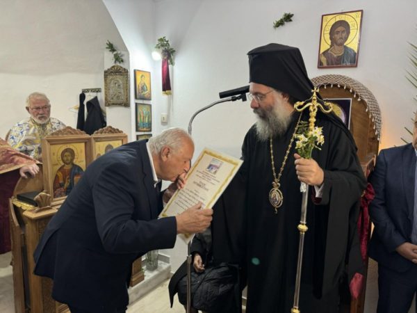 Προ της απολύσεως της Θείας Λειτουργίας, τον Σεβασμιώτατο προσφώνησε ο κτήτορας του Ιερού Ναού κ. Ιωσήφ Κολυβάκης, ο οποίος με θερμούς λόγους καλωσόρισε τον Σεβασμιώτατο και όλους τους ευλαβείς προσκυνητές, και παρεκάλεσε τον Σεβασμιώτατο να επιδώσει έπαινο στον επί σειρά ετών διατελέσαντα Αντιδήμαρχο Παιδείας του Δήμου Ρεθύμνης κ. Γεώργιο Γεωργαλή, για την πολύτιμη προσφορά του στην παιδεία στον τόπο.