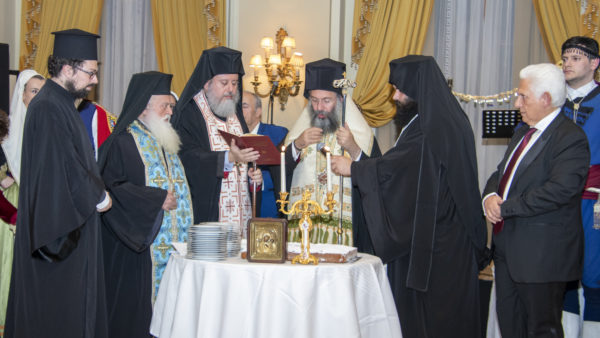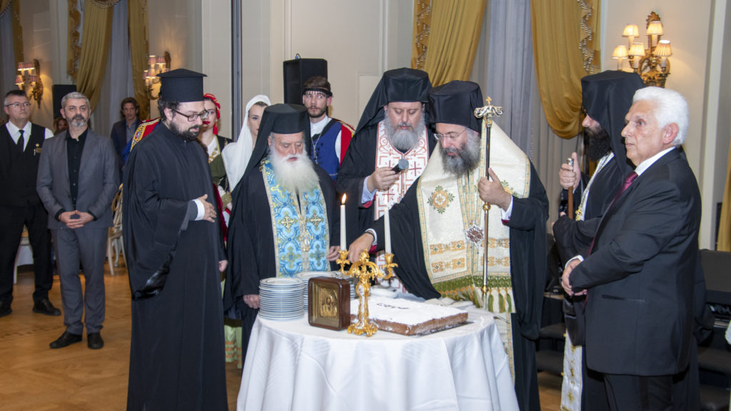 Πριν αρχίσουν οι τιμητικές προσφωνήσεις ο Πρόεδρος πρόσφερε στον Σεβασμιώτατο Μητροπολίτη κ. Πρόδρομο ένα χρυσοκέντητο επιγονάτιο εκ μέρους της οικογένειας του, που έφερε την μορφή του Καλού Ποιμένα.