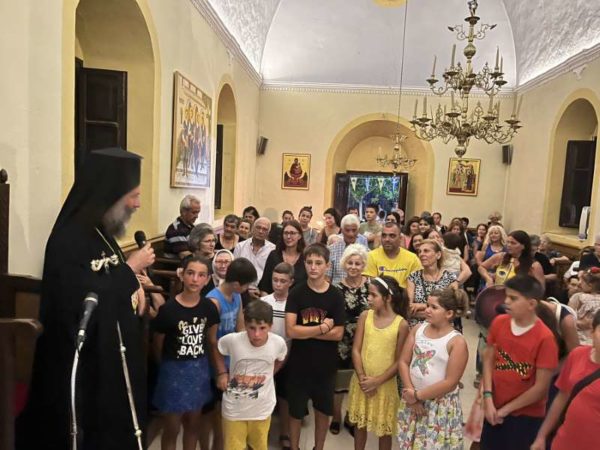Προ της απολύσεως της ακολουθίας, ο Σεβασμιώτατος, κατά την σύντομη προσλαλιά του, αναφέρθηκε στο πανυπερευλογημένο Πρόσωπο της Υπεραγίας Θεοτόκου και στη σπουδαιότητα της θεοτοκοφρούρητης αυτής περιόδου του Ιερού Δεκαπενταυγούστου. Ο Σεβασμιώτατος συνεχάρη τους ανθρώπους, και ιδιαίτερα τα μικρά παιδιά, για τη συμμετοχή τους στις όμορφες αυτές ακολουθίες.