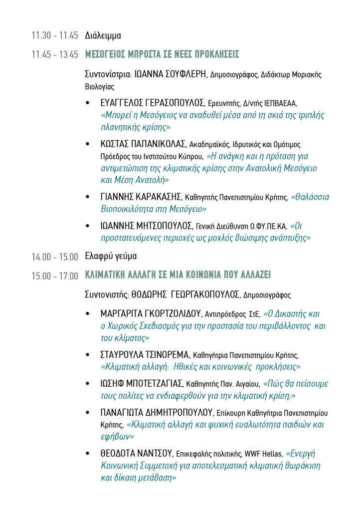 Περιλαμβάνει ομιλίες αξιόλογων προσωπικοτήτων από όλη τη χώρα, οι οποίοι πέραν των διαπιστώσεων, θα προτείνουν δράσεις, προκειμένου η κοινωνία των πολιτών να αφυπνιστεί και να ευαισθητοποιηθεί σχετικά με την κλιματική κρίση και να αναλάβει δράση.
