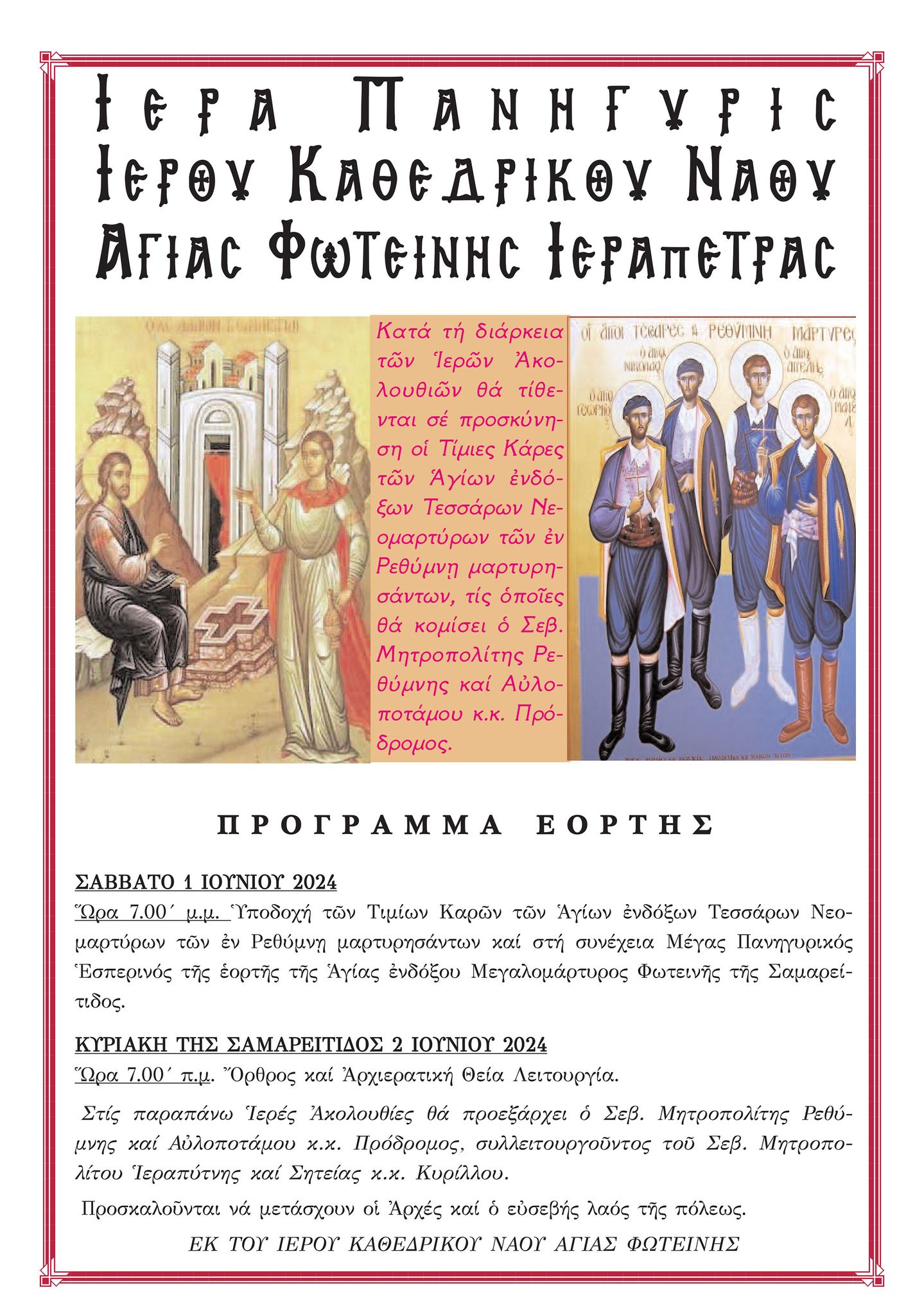 Κατά τη διάρκεια των Ιερών Ακολουθιών θα τίθενται σε προσκύνηση και ευλογία των πιστών οι Τίμιες Κάρες των Αγίων ενδόξων Τεσσάρων Νεομαρτύρων των εν Ρεθύμνη μαρτυρησάντων.