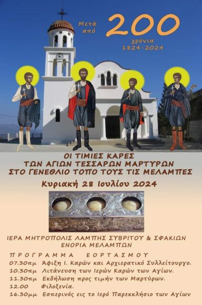 Στο πλαίσιο των εορτασμών για τη συμπλήρωση 200 ετών από τη μαρτυρική τελείωση των Αγίων Τεσσάρων Νεομαρτύρων, Μανουήλ, Αγγελή, Γεωργίου και Νικολάου, των εκ Μελάμπων καταγομένων και εν Ρεθύμνη μαρτυρησάντων, και με την ευχή και ευλογία του Σεβασμιωτάτου Μητροπολίτου Λάμπης, Συβρίτου και Σφακίων κ. Ειρηναίου, θα μεταφερθούν για πρώτη φορά στη γενέτειρά τους, τις Μέλαμπες Αγίου Βασιλείου, οι Τίμιες Κάρες των Αγίων, την Κυριακή, 28 Ιουλίου 2024.
