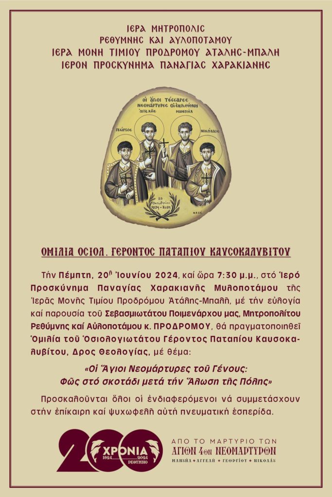 Την Πέμπτη 2ο Ιουνίου στις 19:30, στον Ιερό Προσκύνημα Παναγίας Χαρακιανής Μυλοποτάμου της Ιεράς Μονής Τιμίου Προδρόμου Ατάλης- Μπαλή, με την ευλογία και παρουσία του Μητροπολίτη Ρεθύμνης και Αυλοποτάμου κ. Προδρόμου, θα πραγματοποιηθεί ομιλία του Γέροντος Παταπίου Καυσοκαλυβίτη, Δρ Θεολογίας, με θέμα «Οι Άγιοι Νεομάρτυρες του Γένους: Φως στο σκοτάδι μετά την Άλωση της Πόλης».