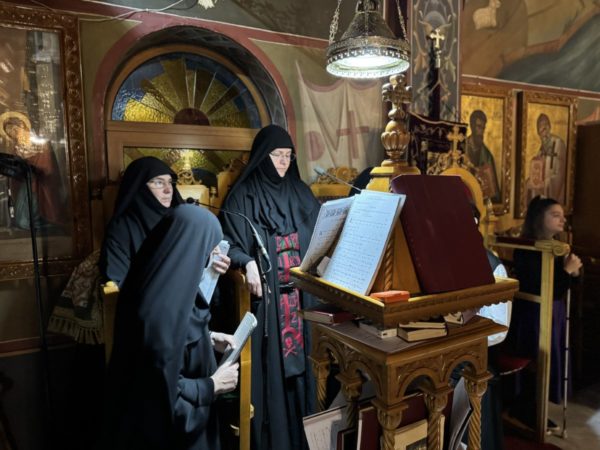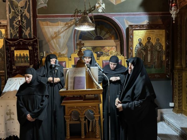 Τους δύο ιεροψαλτικούς χορούς πλαισίωσαν οι Μοναχές από τις γυναικείες Αδελφότητες των Ιερών Μονών Μεταμορφώσεως του Σωτήρος Χριστού Κουμπέ και Αγίας Ειρήνης Ρεθύμνης, συνευχομένων και των Γεροντισσών Μαριάμ και Θέκλας, αντιστοίχως.