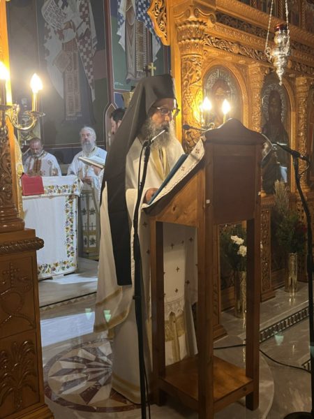 Τον Θείο λόγο, κατόπιν προτροπής του Σεβασμιωτάτου κ. Προδρόμου, κήρυξε εμπνευσμένα, ομιλώντας για το μαρτύριο του αίματος και το μαρτύριο της συνειδήσεως, ο Πανοσιολ. Αρχιμανδρίτης Τιμόθεος Παναγιωτάκης, Ηγούμενος της Ιεράς Πατριαρχικής και Σταυροπηγιακής Μονής Τιμίου Σταυρού Βωσάκου.