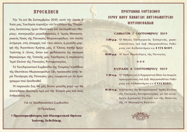 ΠΡΟΓΡΑΜΜΑ ΠΑΝΗΓΥΡΕΩΣ ΠΑΝΑΓΙΑΣ ΑΝΤΙΦΩΝΗΤΡΙΑΣ ΜΥΡΙΟΚΕΦΑΛΩΝ της Ιεράς Μητροπόλεως Ρεθύμνης και Αυλοποτάμου, καθώς αυτό επισυνάπτεται αναλυτικά. Την Κυριακή 8 Σεπτεμβρίου 2019, θα λάβει χώρα Αρχιερατική Θεία Λειτουργία ιερουργούντος του Σεβ. Μητροπολίτου Ρεθύμνης και Αυλοποτάμου. κ. Ευγενίου.