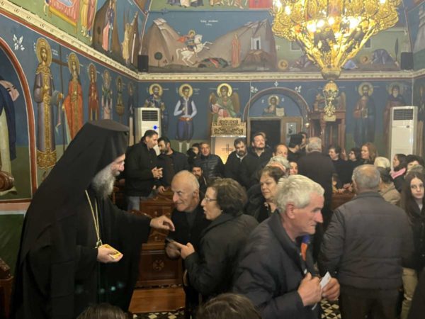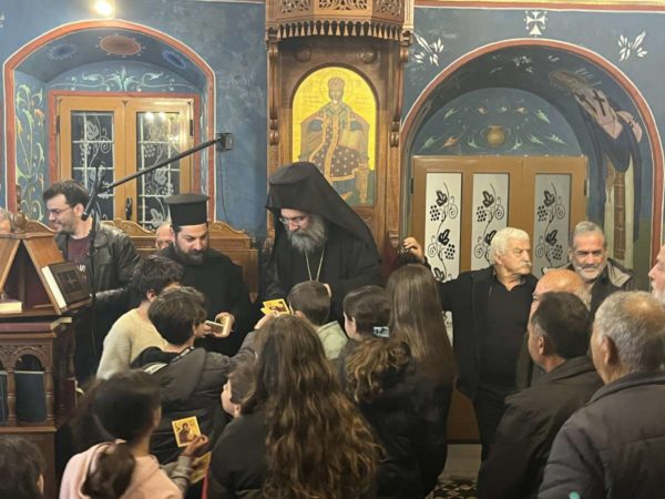 Τον Σεβασμιώτατο υποδέχθηκαν στις 26ης Μαρτίου με θερμές εκδηλώσεις αγάπης τα παιδιά της Ενορίας και πλήθος πιστών, που συνέτρεξαν και συμπροσευχήθηκαν κατά το Μέγα Απόδειπνο.