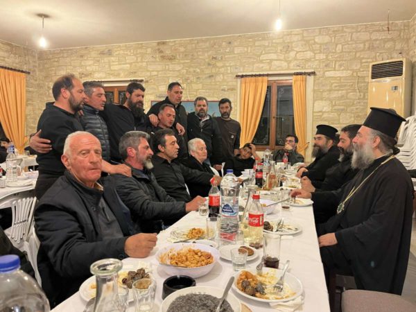 Μετά το πέρας της Ακολουθίας, στην παρακείμενη αίθουσα εκδηλώσεων του Πολιτιστικού Συλλόγου, προσφέρθηκε προς όλους νηστήσιμη τράπεζα, στην οποία ο Πρόεδρος και άλλα μέλη της Τοπικής Κοινότητας υποδέχθηκαν το Σεβασμιώτατο με ριζίτικα τραγούδια.