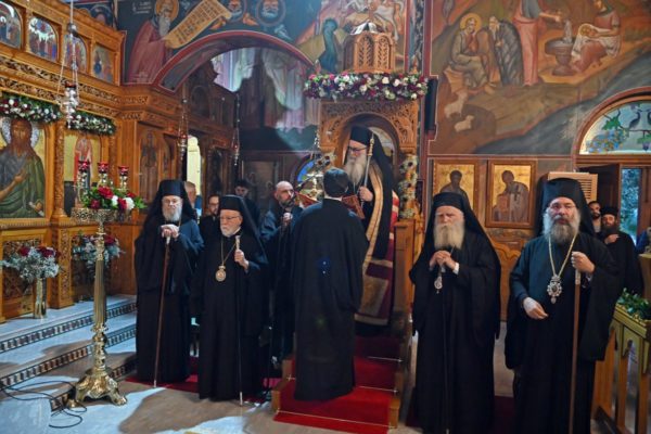 Στα προπύλαια του Ιερού Ναού, ο Σεβασμιώτατος κ. Πρόδρομος καλωσόρισε και παρουσίασε με θερμούς λόγους τους παρισταμένους αγίους Αρχιερείς, εκφράζοντας τις ευχαριστίες της Τοπικής μας Εκκλησίας, ευχαρίστησε δε και όλους, όσοι προσήλθαν στην υποδοχή και όσοι με κάθε τρόπο συνέβαλαν, την Ενορία Μυριοκεφάλων, τον φιλόχριστο Στρατό μας, την Ελληνική Αστυνομία, τα Παραδοσιακά Σωματεία και Συλλόγους του τόπου μας, το Λύκειο των Ελληνίδων, το Σύλλογο Εθελοντών Αιμοδοτών Ρεθύμνου «Δότες Ζωής» και τον Ελληνικό Ερυθρό Σταυρό.