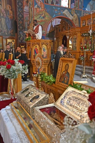 Τα ιερά σεβάσματα υποδέχθηκε ο Σεβασμιώτατος Μητροπολίτης Προικοννήσου κ. Ιωσήφ, ο οποίος και χοροστάτησε κατά τον Εσπερινό και ομίλησε γλαφυρά, επίκαιρα, πατερικά, αλλά και ιστορικά, για την Παναγία και για τους Νεομάρτυρες της πίστεώς μας και τα σύγχρονα μηνύματά τους στους καιρούς μας.