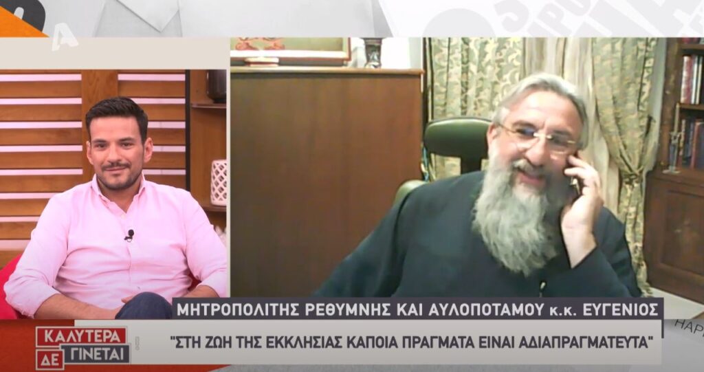 Συνέντευξη του Σεβ. Μητροπολίτου Ρεθύμνης και Αυλοποτάμου κ. Ευγενίου, η οποία παραχωρήθηκε το Σάββατο 16 Μαΐου 2020, στον τηλεοπτικό σταθμό ALPHA και στην εκπομπή “ΚΑΛΥΤΕΡΑ ΔΕΝ ΓΙΝΕΤΑΙ”, μία ημέρα πριν την έναρξη της επαναλειτουργίας των Ιερών Ναών με την παρουσία πιστών, μετά την άρση της σχετικής απαγόρευσης λόγω των μέτρων κατά της πανδημίας Covid-19. “Στη ζωή της Εκκλησίας κάποια πράγματα είναι αδιαπραγμάτευτα” είπε, μεταξύ άλλων, ο Σεβασμιώτατος.