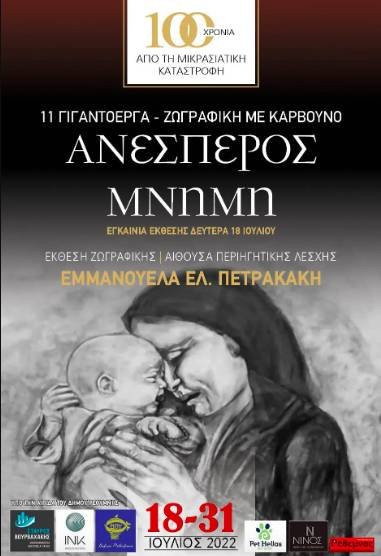 Η Έκθεση είναι αφιερωμένη στην Μικρασιατική Καταστροφή, που συντελέστηκε πριν από 100 ακριβώς χρόνια, και περιλαμβάνει 11 γιγαντοέργα της Ρεθυμνιώτισσας πολιτικού μηχανικού κ. Εμμανουέλας Πετρακάκη φτιαγμένα με κάρβουνο, τα οποία αποτυπώνουν γλαφυρά την τραγωδία που βίωσαν οι Έλληνες της Μικράς Ασίας και τον ξεριζωμό.