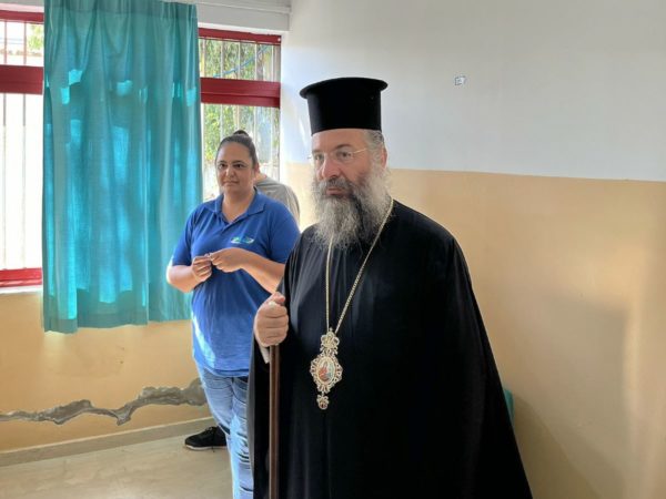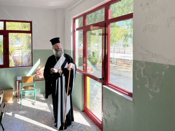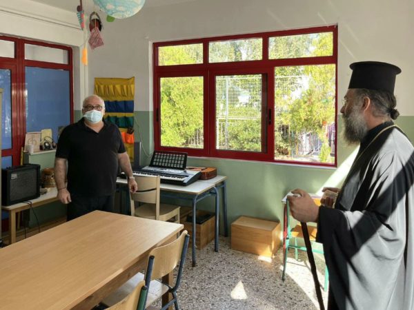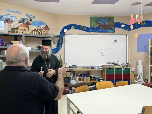 Ο Σεβασμιώτατος συνομίλησε με τη Διευθύντρια, τους Εκπαιδευτικούς και το Σύλλογο Γονέων και χαιρέτισε τα παιδιά, στα οποία προσέφερε ως ευλογία μικρές ιερές εικόνες.