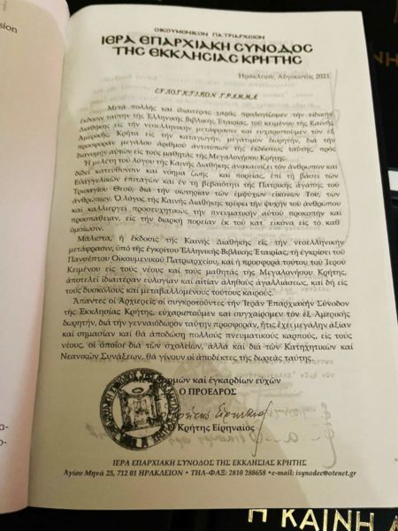 Και στις δύο περιπτώσεις, ο Σεβασμιώτατος διένειμε στους μαθητές την Καινή Διαθήκη, η οποία εκδόθηκε από την Εκκλησία Κρήτης, με τη χορηγία Ελληνοαμερικανού κρητικής καταγωγής, προκειμένου να διανεμηθεί στους μαθητές όλων των σχολείων της μεγαλονήσου Κρήτης.