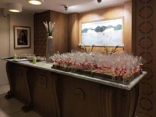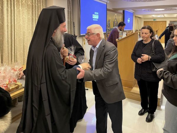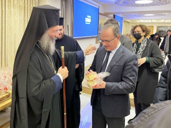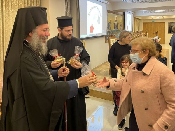 Μετά την ολοκλήρωση της εκδήλωσης, ο Σεβασμιώτατος διένειμε την αγιοβασιλόπιτα προς όλους και ακολούθησε κέρασμα στους φιλόξενους χώρους του Κέντρου «Θεομήτωρ». Το φλουρί της αγιοβασιλόπιτας έλαχε στην κ. Ελένη Κυριακάκη, Διευθύντρια του Συλλόγου «ΑΓΑΠΗ».