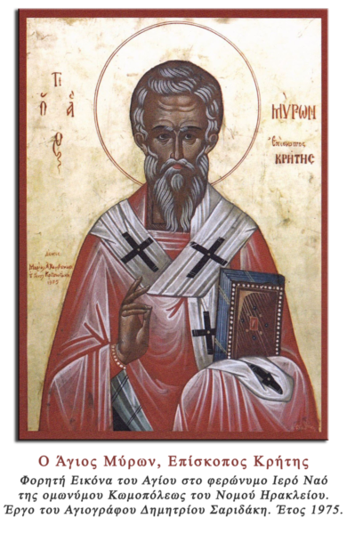 Με την ευλογία και άδεια του Σεβ. Αρχιεπισκόπου Κρήτης κ. Ειρηναίου και του Σεβ. Μητροπολίτου Ρεθύμνης και Αυλοποτάμου κ. Ευγενίου, η Ενορία Αγίας Κυριακής Γουλεδιανών Ρεθύμνου θα υποδεχθεί απότμημα των ιερών λειψάνων του Αγίου Μύρωνος, Επισκόπου Κρήτης (4ος αιώνας), τα οποία θα κατατεθούν μόνιμα στον Ιερό Ναό της Αγίας Κυριακής.