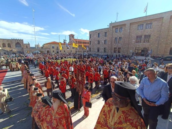 Ακολούθησε η λιτάνευση της Ιεράς Εικόνος και του τιμίου Λειψάνου του Αγίου και της εφεστίου Εικόνας της Παναγίας Σκιαδενής στο κέντρο της πόλεως, συνοδεία της φιλαρμονικής του Δήμου Ρόδου.
