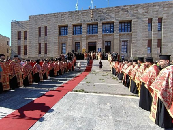 Η πομπή κατέληξε στην είσοδο του Δημαρχιακού Μεγάρου, όπου έλαβε χώρα η ευλόγηση των άρτων και στη συνέχεια η απόλυση παρουσία των κληρικών της πόλεως Ρόδου και των Αρχών.