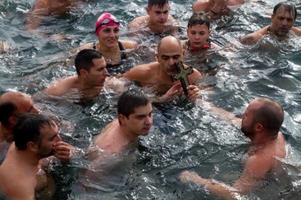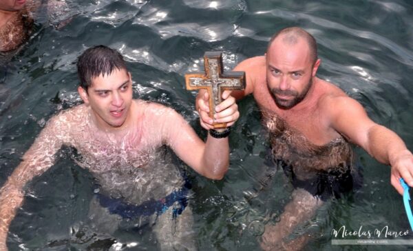 Τον Σταυρό ανέσυραν από τα παγωμένα νερά oι Καριοφυλάκης Ευάγγελος και Ζαρίφης Γεώργιος.