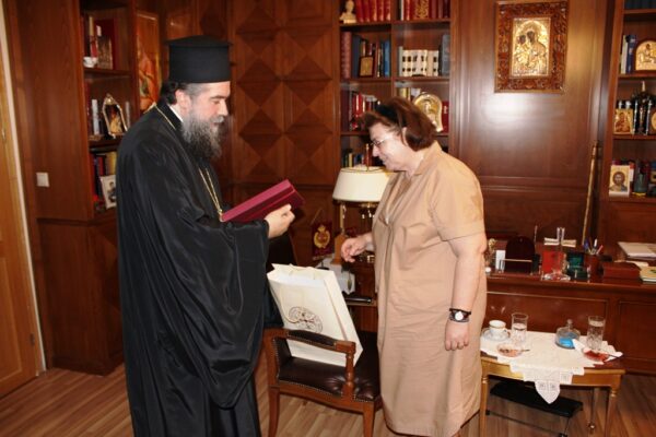 Τέλος ο Σεβ. κ. Θεολόγος προσέφερε στην κ. Υπουργό εκδόσεις της Ιεράς Μητροπόλεως και αντίγραφο της ιεράς εικόνος της Παναγίας «Πονολυτρίας» των Σερρών, ως ευλογία και αγαθή ενθύμηση της επισκέψεως.