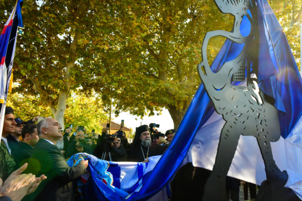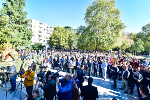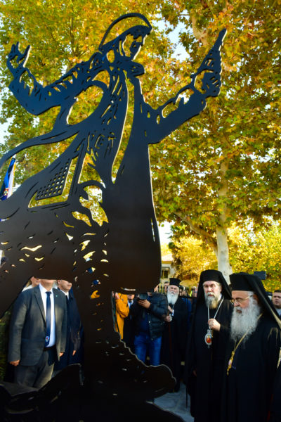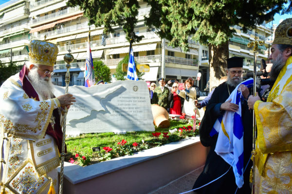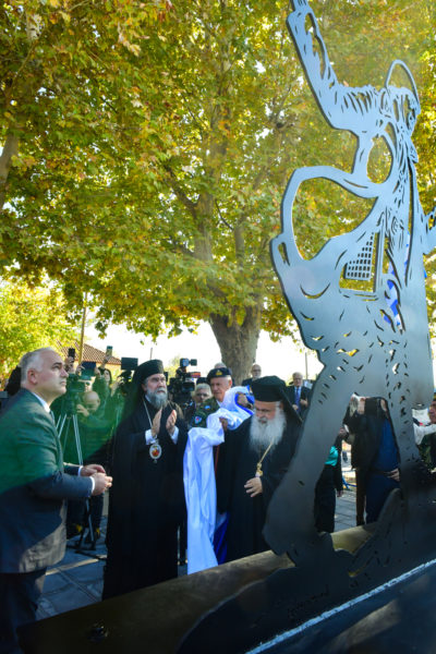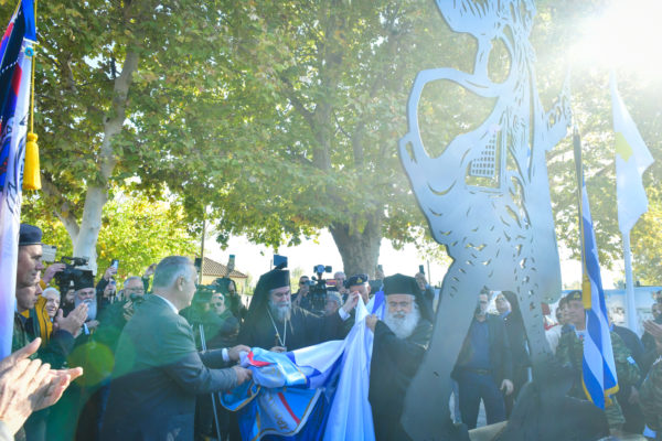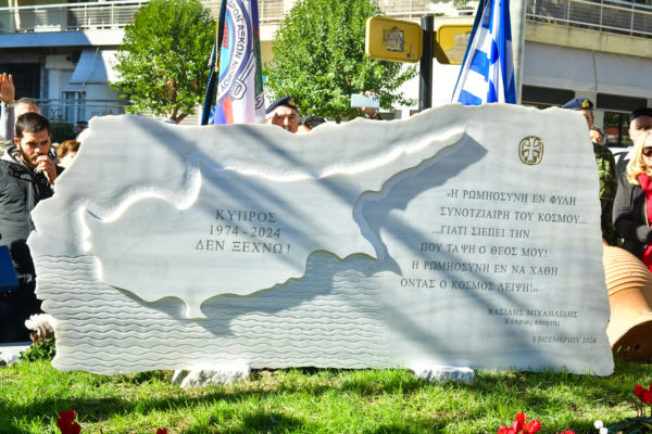 Στη συνέχεια, στην πλατεία «Μητροπολίτου Μαξίμου» του ιερού Μητροπολιτικού Ναού, ο Μακαριώτατος κ.κ. Γεώργιος, μετά βαθυτάτης συγκινήσεως, απεκάλυψε μαρμάρινο λίθο, φέροντα λελαξευμένη την μαρτυρική μεγαλόνησο και τους στίχους του Κυπρίου ποιητού Β. Μιχαηλίδη: «Η ΡΩΜΗΟΣΥΝΗ ΕΝ ΦΥΛΗ ΣΥΝΟΤΖΙΑΡΗ ΤΟΥ ΚΟΣΜΟΥ…ΓΙΑΤΙ ΣΙΕΠΕΙ ΤΗΝ ΠΟΥ ΤΑ’ΨΗ Ο ΘΕΟΣ ΜΟΥ! Η ΡΩΜΗΟΣΥΝΗ ΕΝ ΝΑ ΧΑΘΗ ΟΝΤΑΣ Ο ΚΟΣΜΟΣ ΛΕΙΨΗ!», μετά της σχετικής αναθηματικής επιγραφής: «ΚΥΠΡΟΣ 1974-2024. ΔΕΝ ΞΕΧΝΩ! 8 ΝΟΕΜΒΡΙΟΥ 2024».