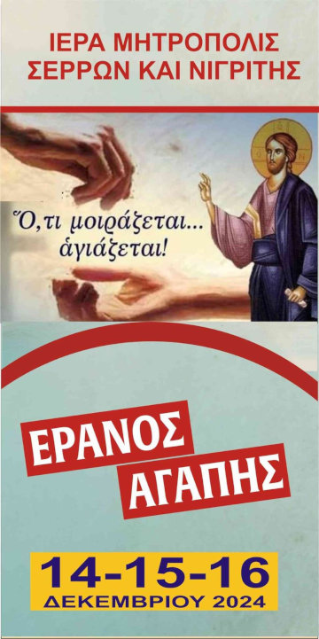 Όπως κάθε χρόνο έτσι και φέτος θα πραγματοποιηθεί ο Έρανος της Αγάπης από τις Ενορίες της Ιεράς Μητρόπολης Σερρών και Νιγρίτης από σήμερα Σάββατο 14 έως και την Δευτέρα 16 Δεκεμβρίου.