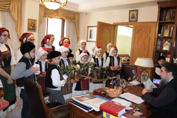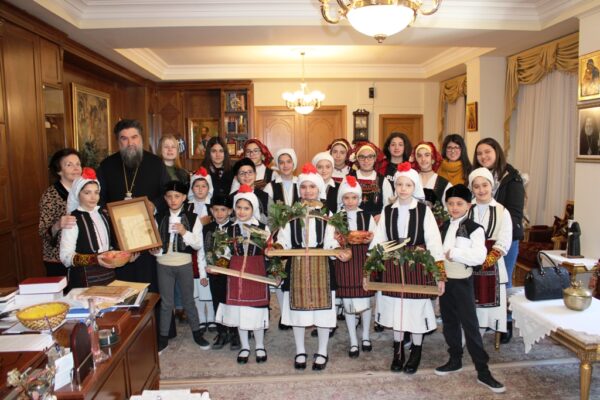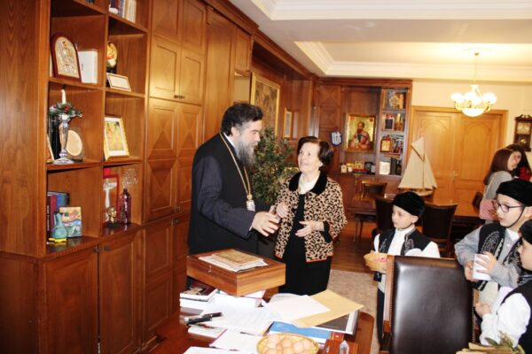 Ο Σεβασμιώτατος υποδέχθηκε τα 30 και πλέον παιδιά, συνοδευόμενα από την Πρόεδρο του Λυκείου Ελληνίδων κ. Στ. Ελευθεριάδου και μέλη του Συλλόγου και άκουσε από τους μικρούς αγγελιοφόρους της Άνοιξης, τα παραδοσιακά κάλαντα της Ανοίξεως, τα «χελιδονίσματα». Τα παιδιά, ενδεδυμένα τις παραδοσιακές τους στολές και με ξύλινα ομοιώματα χελιδονιών στα χέρια, ευχαρίστησαν τον πνευματικό τους πατέρα για την φιλοξενία και του προσέφεραν τον παραδοσιακό «μάρτη».