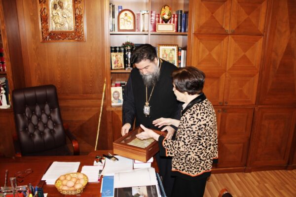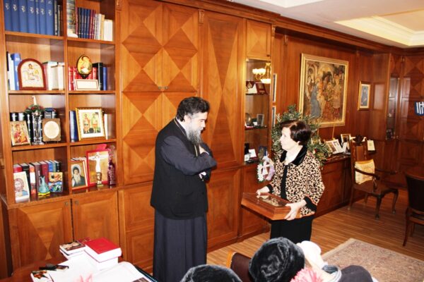 Η κ. Στ. Ελευθεριάδου αφού ευχαρίστησε τον Σεβασμιώτατο για την διαχρονική πατρική του δοχή και αγάπη, του παρέδωσε μία παλαίτυπη έκδοση της Ιλιάδας και της Οδύσσειας του Ομήρου, τυπωμένη στη Βιέννη το έτος 1551, ένα Αναστασιματάριο του έτους 1933 και σπάνιες σειρές γραμματοσήμων, όλα ιστορικά κειμήλια του Λυκείου Ελληνίδων Σερρών.