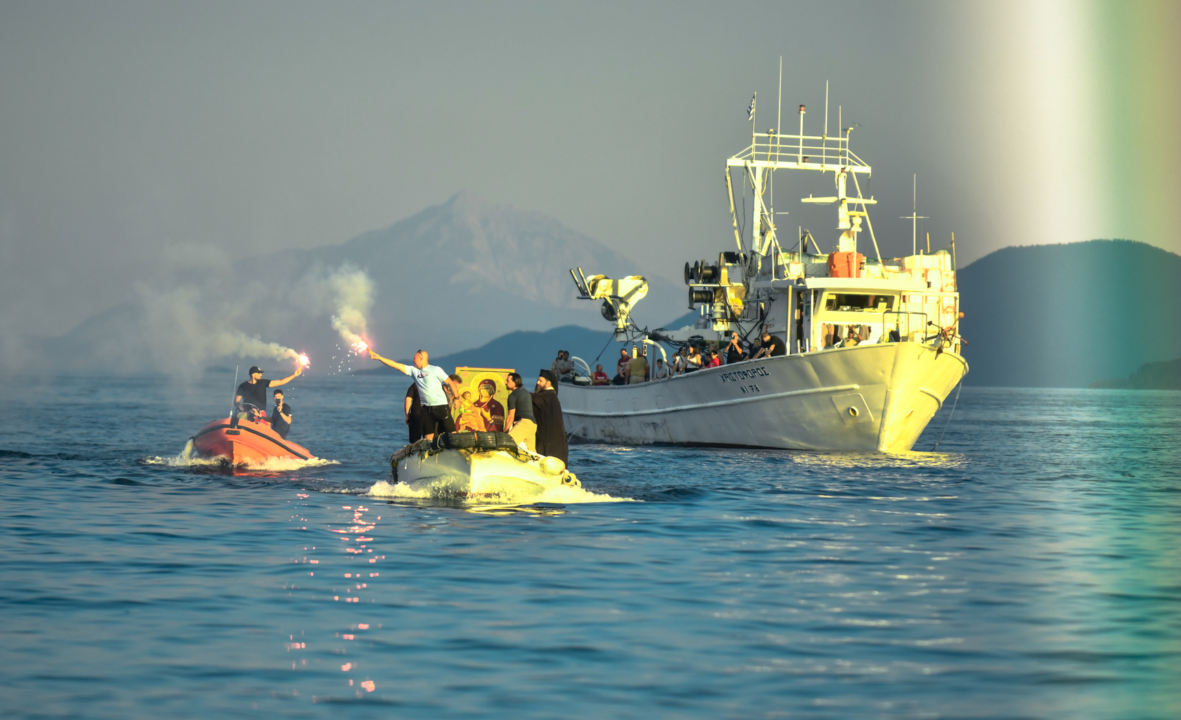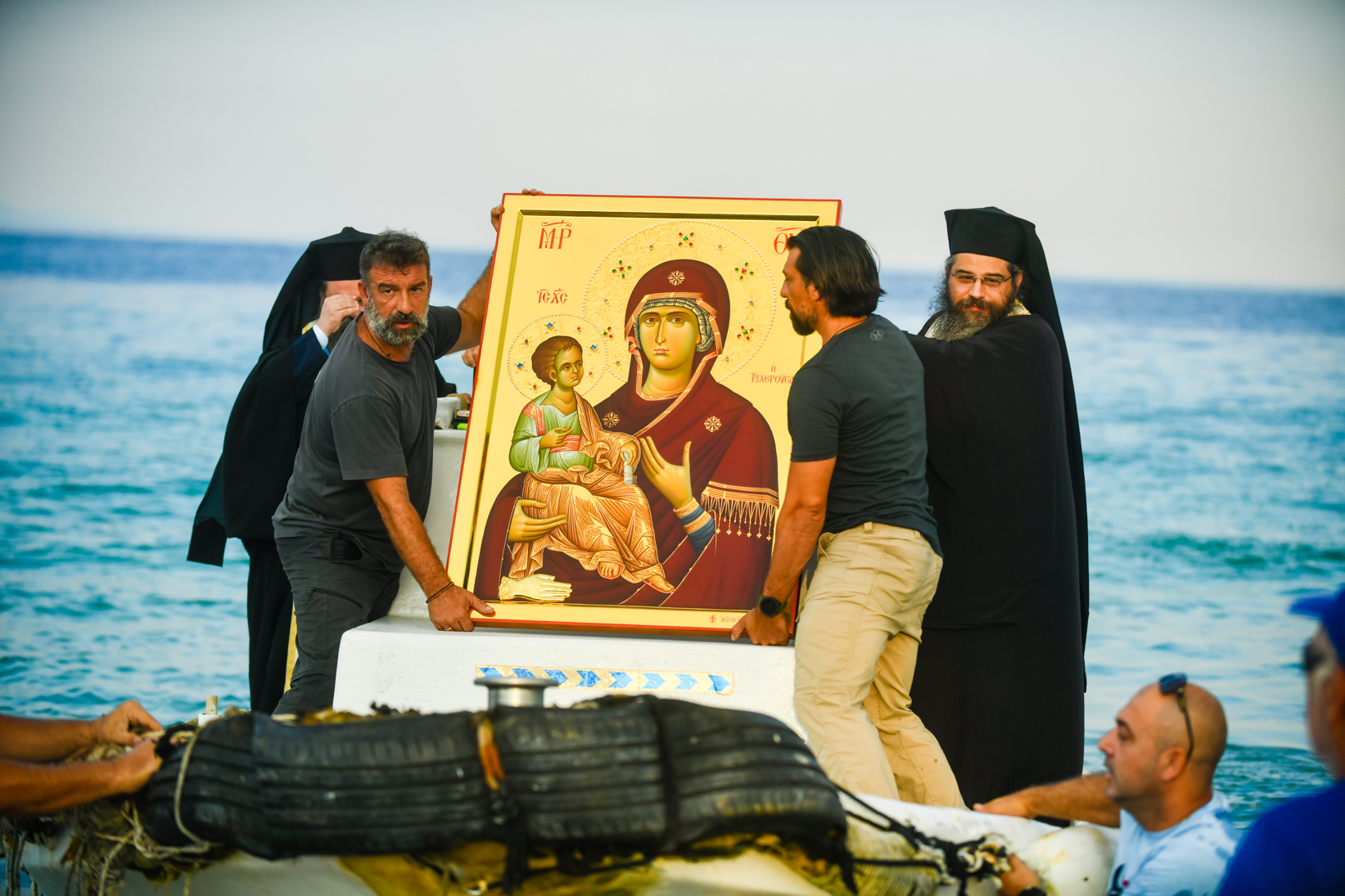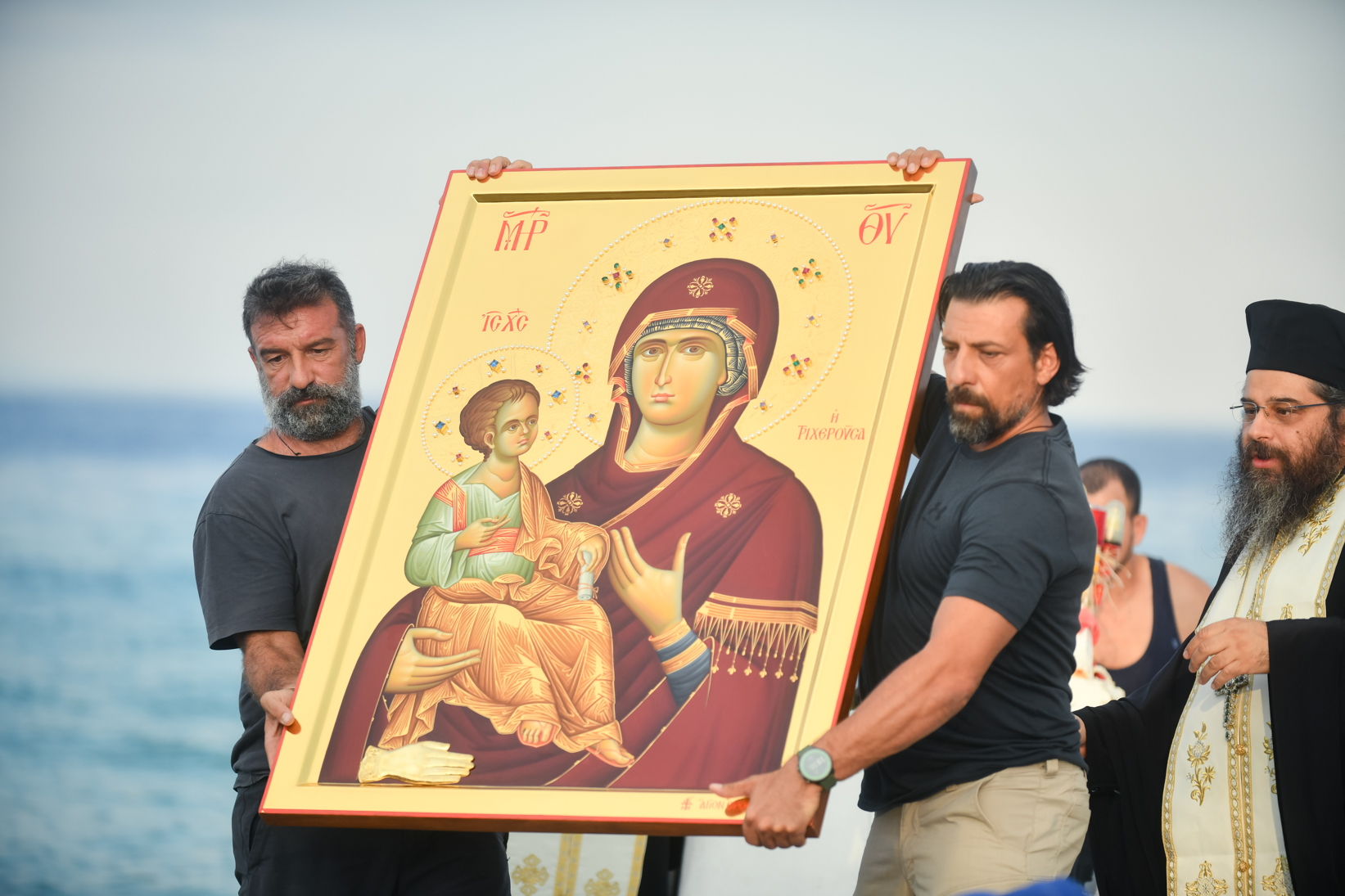 Η υποδοχή του χαριτοβρύτου θεομητορικού εικονίσματος, που φιλοτεχνήθηκε από δεξιοτέχνες Πατέρες, μύστες της ιεράς τέχνης του Ευαγγελιστού Λουκά, του ιερού Κελίου του Αγ. Νικολάου «Μπουραζέρη» της παλαιφάτου Αθωνικής Μονής Χιλανδαρίου, πραγματοποιήθηκε μέσα σε κλίμα βαθιάς συγκινήσεως και πνευματικής ανατάσεως, στην προβλήτα της παραθαλάσσιας ακτής της Ασπροβάλτας, από τον Σεβ. Μητροπολίτη Σερρών και Νιγρίτης κ. Θεολόγο, τον ευαγή Κλήρο, τον Δήμαρχο Βόλβης κ. Διαμαντή Λιάμα, τις λοιπές Αρχές του τόπου, αντιπροσωπείες πολιτιστικών συλλόγων με τις παραδοσιακές ενδυμασίες και τα λάβαρά τους, καθώς και από πλήθος φιλοπάρθενων χριστιανών, που προσήλθαν για να προσκυνήσουν και να λάβουν την χάρη και την ευλογία της Κυρίας Θεοτόκου. Ακολούθως, σχηματίσθηκε λιτανευτική πομπή με την συνοδεία της Φιλαρμονικής Ορχήστρας του Δήμου Βόλβης, προς τον ιερό Ναό Αγ. Γεωργίου, όπου τελέσθηκε η επίσημος Δοξολογία επί τη ελεύσει της ιεράς εικόνος.