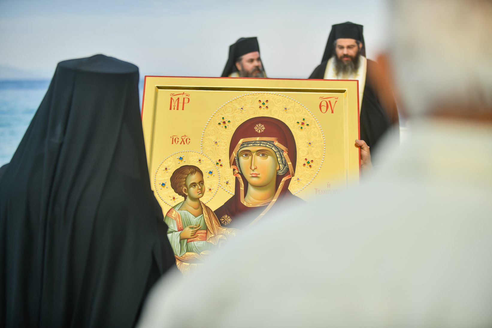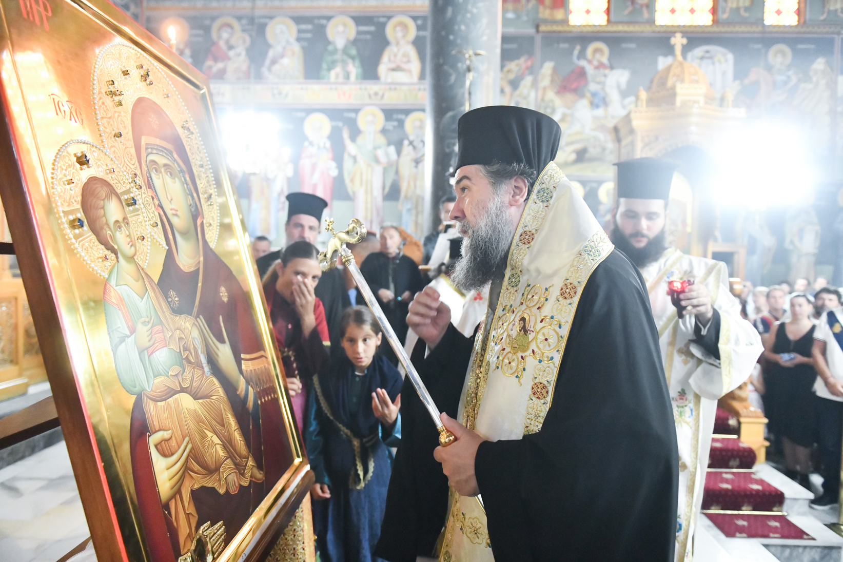 Η πανύμνητος Μαρία, το νοητό μεθόριο μεταξύ κτιστού και ακτίστου κόσμου, η χαρά των αγγέλων και η δόξα των ανθρώπων, ο λογικός Παράδεισος και ο ηγιασμένος Ναός του Θεού του Υψίστου, ηθέλησε σ’ αυτούς τους δυσκόλους καιρούς να ευλογήσει τον τόπο μας, με την έλευση και την μόνιμη αγιαστική παραμονή του ιερού εικονίσματός Της, του ορατού αυτού συνδέσμου με την ευσέβεια και την πίστη των αγιορειτών Πατέρων και μάλιστα των Πατέρων της Ιεράς Μονής Χιλανδαρίου, σ’ αυτόν τον ευλογημένο τόπο της Μητροπολιτικής μας επαρχίας. Η ιερά εικών της Θεομήτορος της ‘’Τριχερούσσης’’, που ευρίσκεται ενώπιόν μας, μας καλεί με μυστικές και άγιες φωνές, να αντλήσουμε χάρη, δύναμη και κουράγιο, από την σεπτή μορφή Της για τον πνευματικό μας αγώνα.