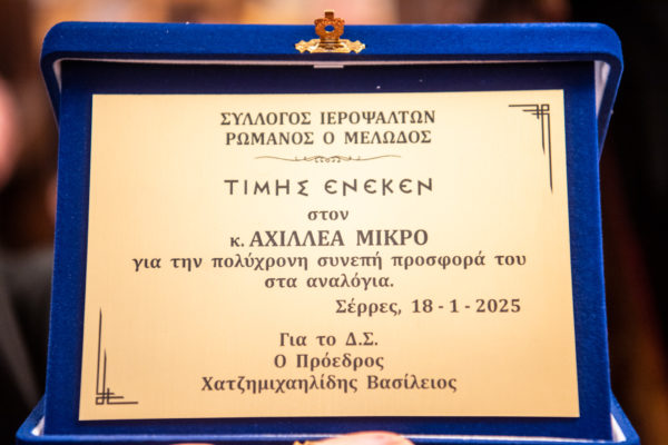 Προ της απολύσεως της ιεράς ακολουθίας, ο Σεβ. Ποιμενάρχης της Σερραϊκής Εκκλησίας κ. Θεολόγος, κατόπιν ευγενούς παρακλήσεως του Προέδρου κ. Βασιλείου Χατζημιχαηλίδη και των μελών του Συλλόγου Ιεροψαλτών της Εκκλησίας των Σερρών «Ρωμανός ο Μελωδός», ετίμησε τον κ. Αχιλλέα Μικρό, διά τιμητικής πλακέτας, για όσα φιλοθέως και φιλοπόνως, επί μακρά σειρά ετών προσφέρει, στη διακονία του ιερού αναλογίου, ως Πρωτοψάλτης του ιερού Ναού Αγ. Αθανασίου Νιγρίτης.