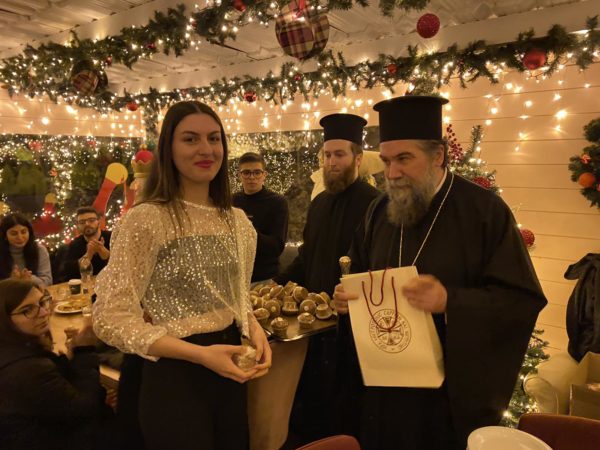 Ακολούθως, στις 8:00 το βράδυ, ο Σεβασμιώτατος παρευρέθηκε στη σύναξη φοιτητριών και φοιτητών – νέων της Εκκλησίας των Σερρών και της Νιγρίτης, που πραγματοποιήθηκε με την φροντίδα του Γραφείου Νεότητος, στο «Cityzen» στην Ακρόπολη των Σερρών. Η προσέλευση των νέων ήταν εντυπωσιακή και συγκινητική.Ο Σεβασμιώτατος αφού ευλόγησε την πατροπαράδοτη Αγιοβασιλειόπιτα, ομίλησε προς όλους τους φοιτητές και τις φοιτήτριες, τονίζοντας μεταξύ άλλων την μεγάλη αξία της πίστεως στον Χριστό, ως Θεό και Σωτήρα, στη ζωή των νέων ανθρώπων, που τώρα κτίζουν τη ζωή τους. Τους προέτρεψε να αγωνίζονται με συνέπεια, δύναμη και μεθοδικότητα για την πραγμάτωση των ονείρων και των στόχων τους, σφυρηλατώντας έναν χαρακτήρα με αρχές, ιδανικά και αξίες.Στη συνέχεια, ο Σεβασμιώτατος μοίρασε σταυρουδάκια ως ευλογία σε όλους τους νέους καθώς και τα κομμάτια της Αγιοβασιλειόπιτας, το φλουρί της οποίας αντιστοιχούσε σε ένα χρηματικό ποσό, το οποίο «έλαχε» στην φοιτήτρια της Στρατιωτικής Σχολής Ευελπίδων, κ. Παναγιώτα Παπάζογλου.