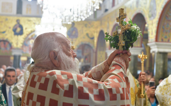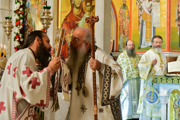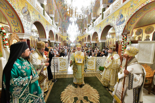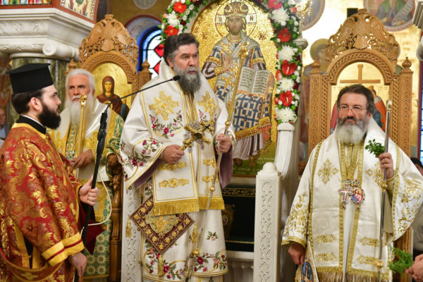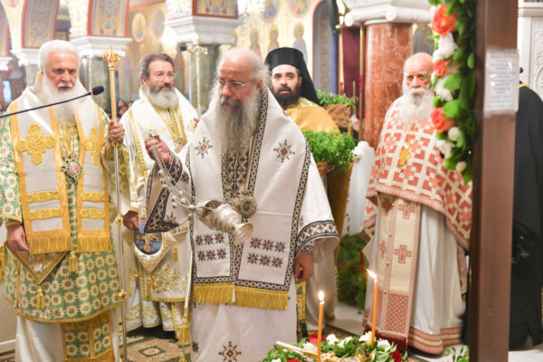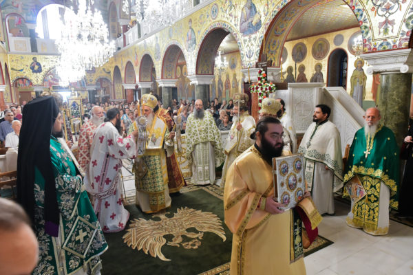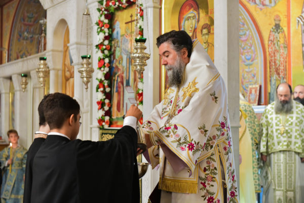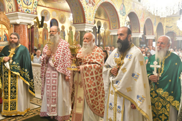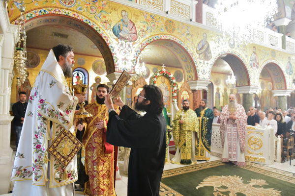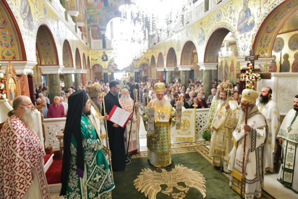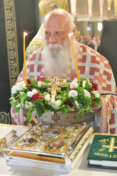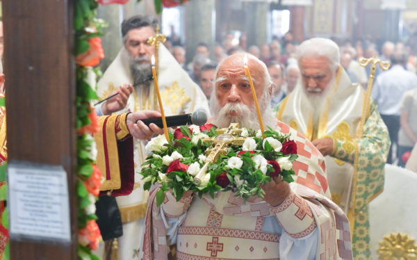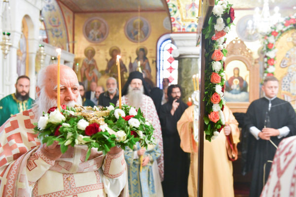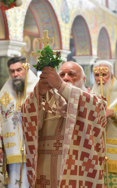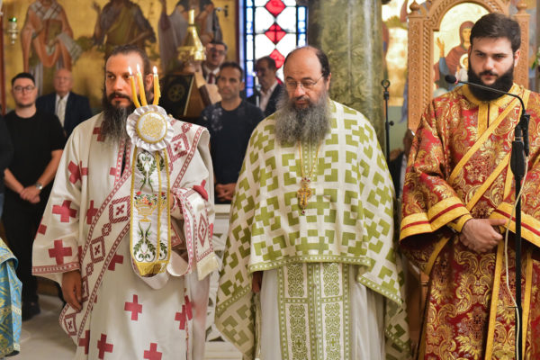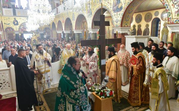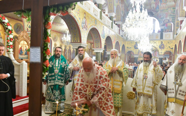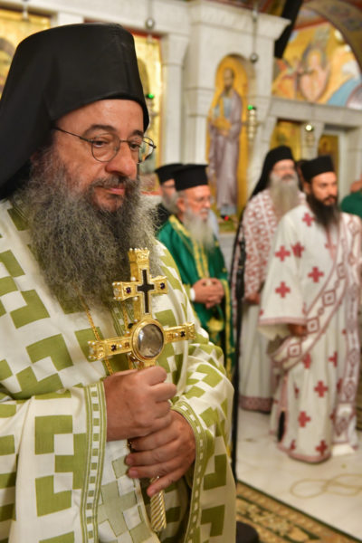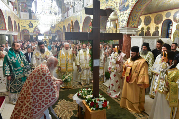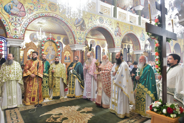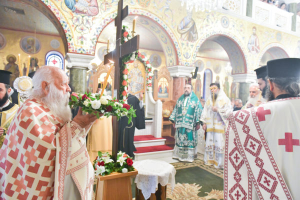 Στον πανηγυρίζοντα, ιερό Ναό Τιμίου Σταυρού Σερρών, όπου από της παρελθούσης Τετάρτης 11 Σεπτεμβρίου, ευρίσκονται αποτμήματα του Ζωομυρίστου Ξύλου και του αρράφου χιτώνος του Κυρίου Ιησού Χριστού, από την ιερά, Σταυροπηγιακή και Πατριαρχική Μονή Παντοκράτορος Αγ. Όρους, προς κοινό συνεορτασμό μετά της μεγαλωνύμου Δεσποτικής εορτής της παγκοσμίου Υψώσεως του Τιμίου και Ζωοποιού Σταυρού, τελέσθηκε σήμερα, Σάββατο 14 Σεπτεμβρίου, πανηγυρικό, Αρχιερατικό συλλείτουργο.