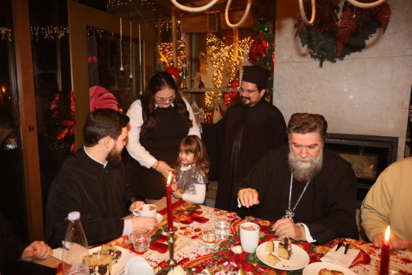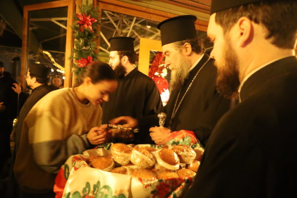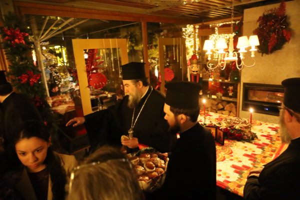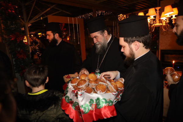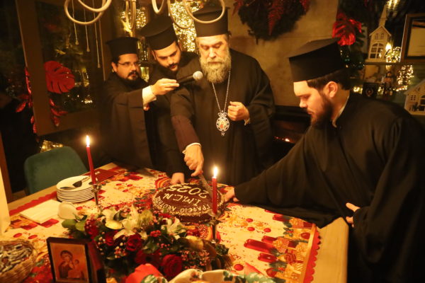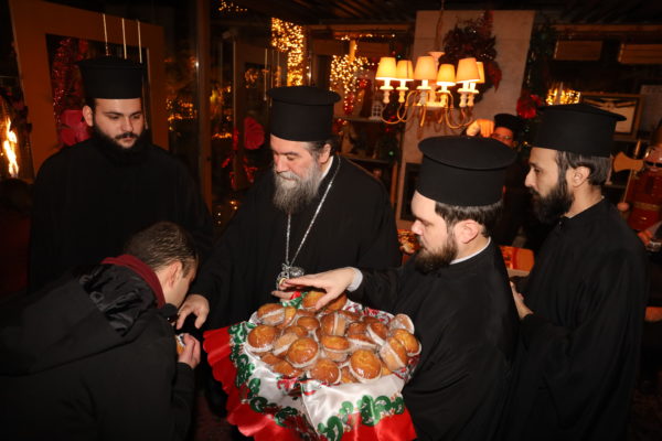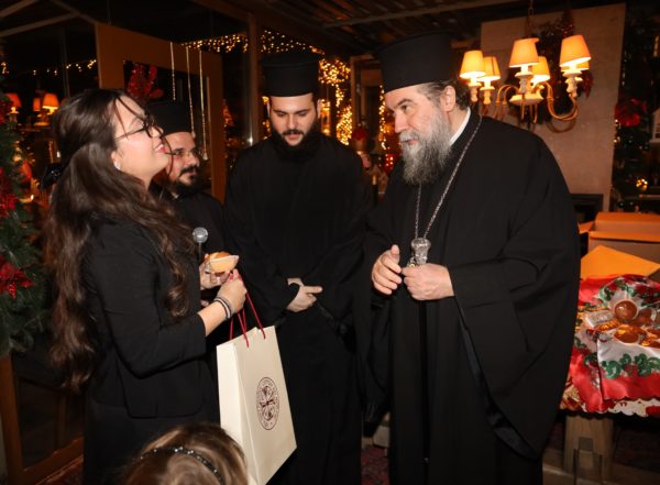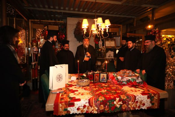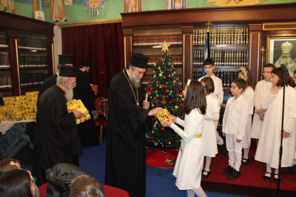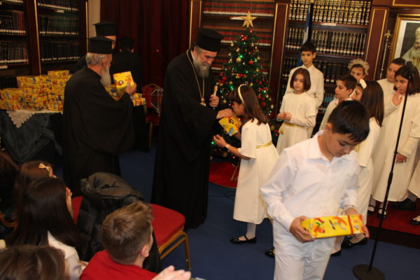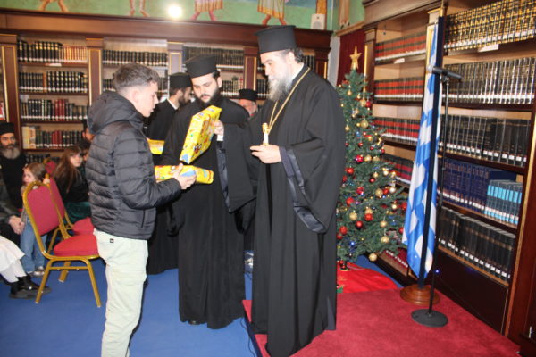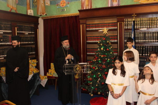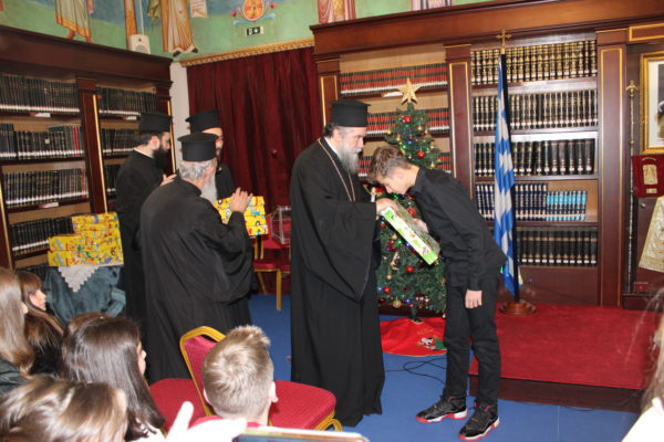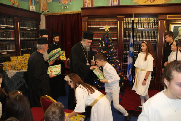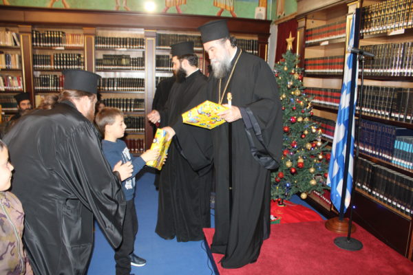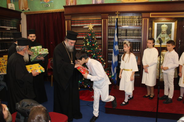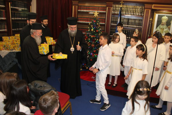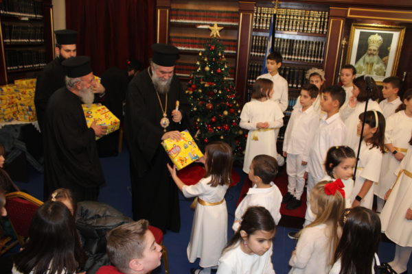 Ο Σεβασμιώτατος ομίλησε με πατρική στοργή στα παιδιά, προσφέροντας σε όλα γλυκίσματα και τα πρωτοχρονιάτικα δώρα τους.