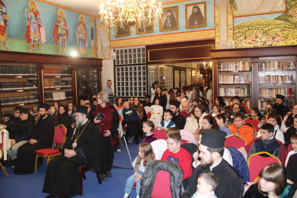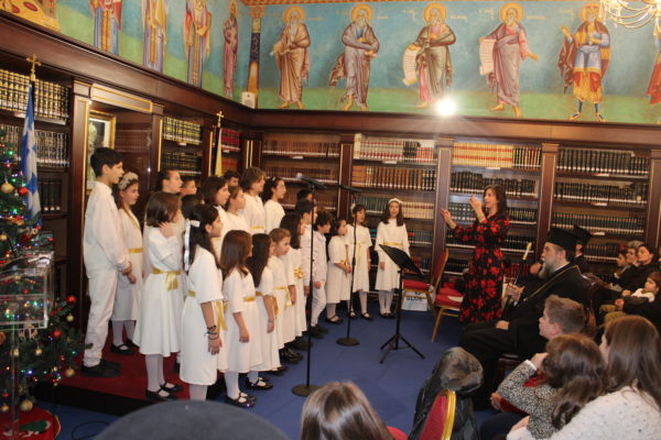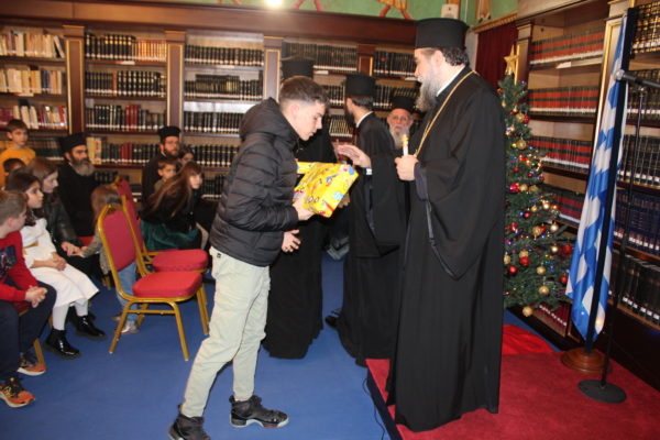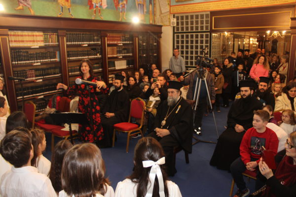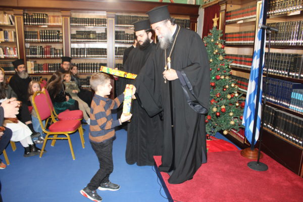 Συγκεκριμένως, στις 6:00 το απόγευμα της Πέμπτης 2 Ιανουαρίου, ο Σεβ. Μητροπολίτης Σερρών και Νιγρίτης κ. Θεολόγος καλωσόρισε τους μικρούς φίλους του Χριστού μας στην εορταστική εκδήλωση, που διοργάνωσε η Σερραϊκή Εκκλησία στην αίθουσα «ΑΡΧΙΕΠΙΣΚΟΠΟΣ ΧΡΙΣΤΟΔΟΥΛΟΣ» της εκκλησιαστικής βιβλιοθήκης «ΜΥΡΙΟΒΙΒΛΟΣ» του «ΜΑΞΙΜΕΙΟΥ» Ιδρύματός Της.