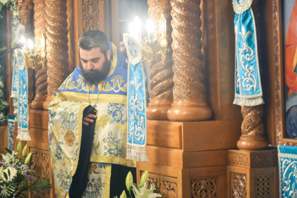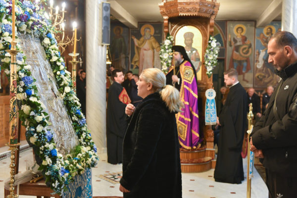 Προ της απολύσεως της ιεράς ακολουθίας του Εσπερινού, ο Σεβασμιώτατος, ευχήθηκε σ’ όλους έτη πολλά, ευλογημένα και παναγιοσκέπαστα, επικαλέσθηκε δε την κραταιά προστασία και σκέπη της μεγάλης Μητέρας, Υπεραγίας Θεοτόκου, σημειώνοντας μεταξύ άλλων και τα εξής: