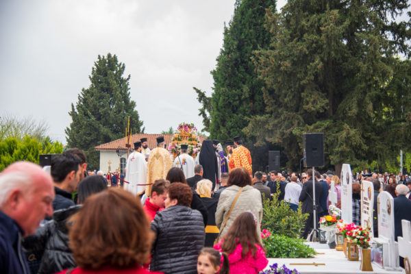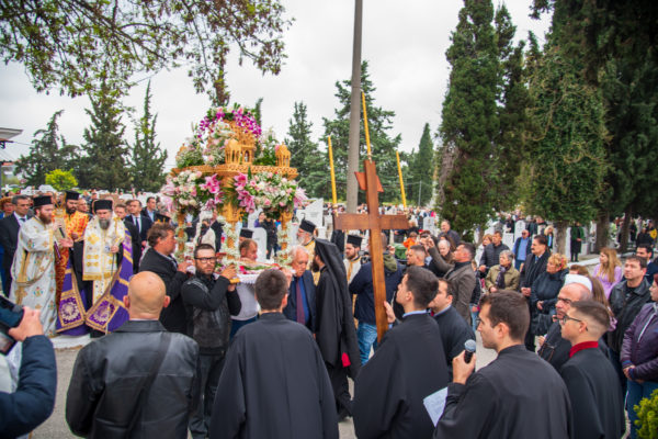 Στις 3:00 το μεσημέρι, ο Σεβασμιώτατος κ. Θεολόγος μετέβη στο Α’ Κοιμητήριο Σερρών, όπου επί του ειδικώς διαμορφωμένου υπερώου, πάνω ακριβώς από το οστεοφυλάκιο,μαζί με τον ιερό κλήρο της πόλεως τέλεσαν την ιερά ακολουθία της Αποκαθηλώσεως και έψαλαν τα εγκώμια. Εν συνεχεία, το αποκαθηλωθέν “Σώμα” του Κυρίου μας οδηγήθηκε λιτανευτικώς στο πλησίον του υπερώου λελατομημένο εκ πέτρας κενοτάφιο.