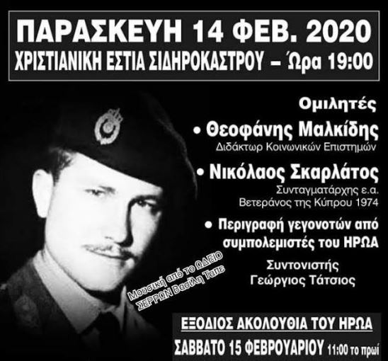 Η Εξόδιος Ακολουθία του Ήρωα, κατά το Σάββατο 15 Φεβρουαρίου και ώρα 11.00 το πρωϊ στον Ι.Ν. Ευαγγελίστριας Σιδηροκάστρου.