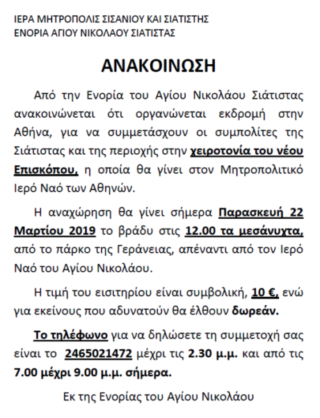 Από την ενορία του Αγίου Νικολάου Σιατίστης, οργανώνεται εκδρομή προς την Αθήνα, ώστε οι ενορίτες να συμμετάσχουν στη χειροτονία του νέου εψηφισμένου Μητροπολίτου Σισανίου και Σιατίστης, κ. Αθανασίου, η οποία θα τελεσθεί στη Μητρόπολη Αθηνών, κατά το Σάββατο 23 Μαρτίου 2019. Η αναχώρηση θα λάβει χώρα κατά τις 12.00 τα μεσάνυχτα της Παρασκευής από το πάρκο της Γεράνειας, απέναντι από τον Ιερό Ναό του Αγίου Νικολάου.