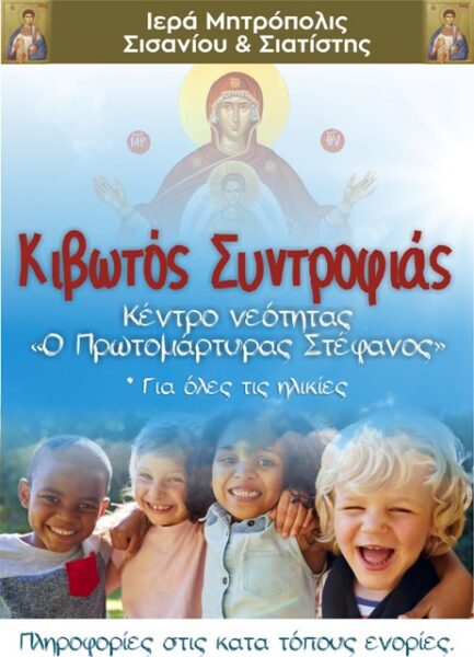 ΚΙΒΩΤΟΣ ΣΥΝΤΡΟΦΙΑΣ – Κέντρο Νεότητος “Ο Πρωτομάρτυρας Στέφανος” – Για Όλες τις Ηλικίες – της Ιεράς Μητροπόλεως Σισανίου και Σιατίστης. Πληροφορίες στις κατά τόπους Ενορίες.