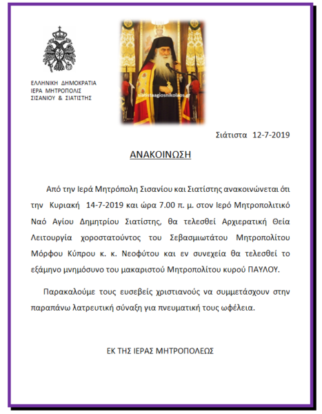 Απο την Ιερά Μητρόπολη Σισανίου και Σιατίστης, ανακοινώνεται ότι την Κυριακή 14 Ιουλίου 2019 και ώρα 7.00 π.μ. στον Ιερό Μητροπολιτικό Ναό Αγίου Δημητρίου Σιατίστης, θα τελεσθεί Αρχιερατική Θεία Λειτουργία χοροστατούντος του Σεβ. Μητροπολίτου Μόρφου κ. Νεοφύτου και εν συνεχεία θα τελεσθεί το εξάμηνο μνημόσυνο του μακαριστού Μητροπολίτου κυρού Παύλου.