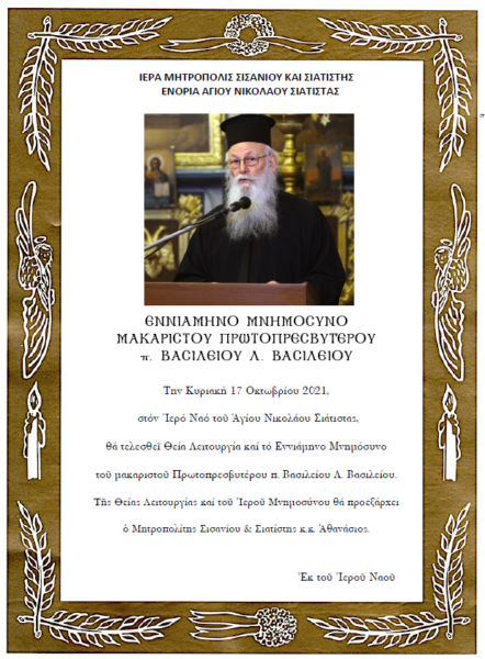 Το Εννιάμηνο μνημόσυνο υπέρ αναπαύσεως της ψυχής του μακαριστού Πρωτοπρεσβυτέρου π. Βασιλείου Λ. Βασιλείου θα τελεστεί στη Σιάτιστα την Κυριακή 17 Οκτωβρίου.