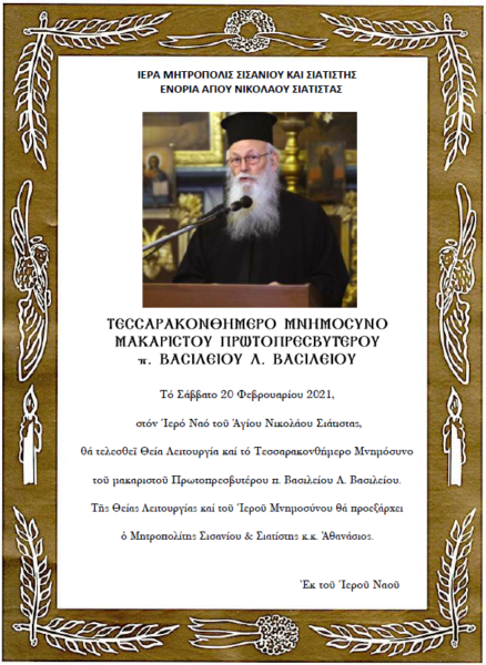 Ιερό τεσσαρακονθήμερο μνημόσυνο υπέρ αναπαύσεως της ψυχής του μακαριστού Πρωτοπρεσβυτέρου π. Βασιλείου Λ. Βασιλείου θα τελεσθεί το Σάββατο 20 Φεβρουαρίου στον Ιερό Ναό Αγίου Νικολάου Σιάτιστας προεξάρχοντος του Σεβασμιωτάτου Μητροπολίτου Σισανίου και Σιατίστης κ. Αθανασίου.