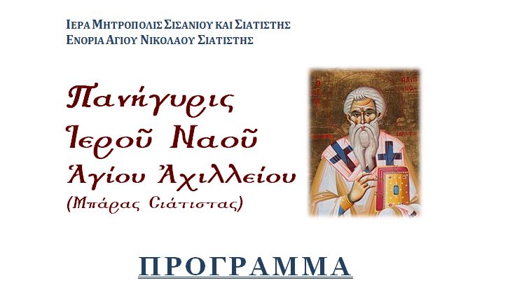Πανηγυρίζει την Τετάρτη 15 Μαΐου 2019, ο Ιερός Ναός Αγίου Αχιλλείου Μπάρας Σιάτιστας. Την Τρίτη 14 Μαΐου στις 8.00 μ.μ. θα τελεσθεί Μέγας Πανηγυρικός Εσπερινός στις 8.00 μ.μ.