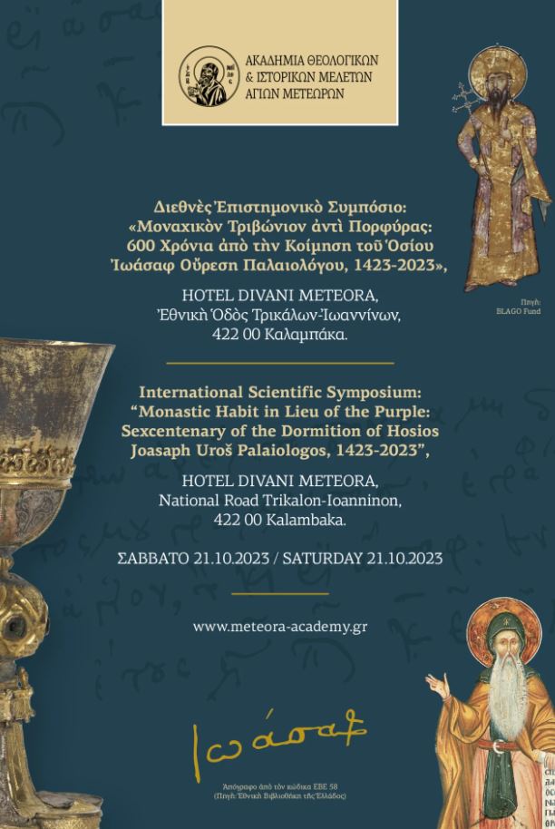 Η Ακαδημία Θεολογικών και Ιστορικών Μελετών Αγίων Μετεώρων, ίδρυμα της Μητρόπολης Σταγών και Μετεώρων, διοργανώνει επιστημονικό συμπόσιο επ’ ευκαιρία της συμπλήρωσης 600 χρόνων από την κοίμηση του Οσίου Ιωάσαφ, δεύτερου κτήτορα της Μονής της Μεταμορφώσεως (Μεγάλο Μετέωρο) και διαδόχου του θεμελιωτή του μοναχισμού στα Μετέωρα, οσίου Αθανασίου.