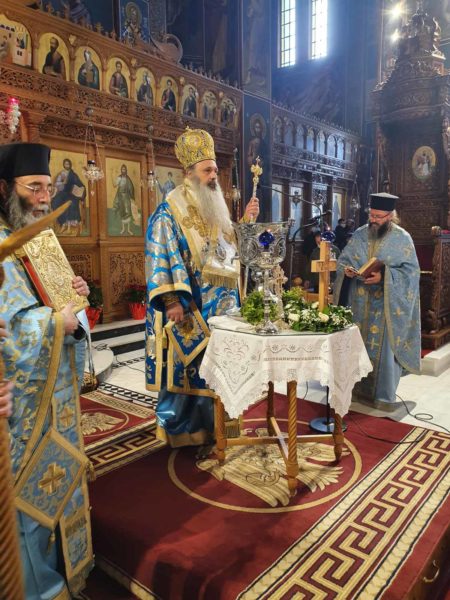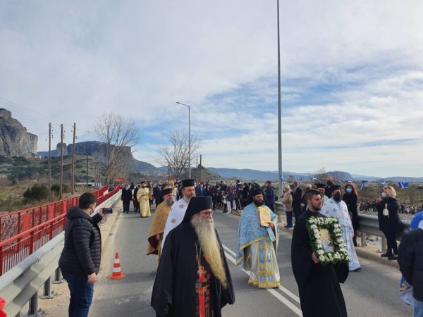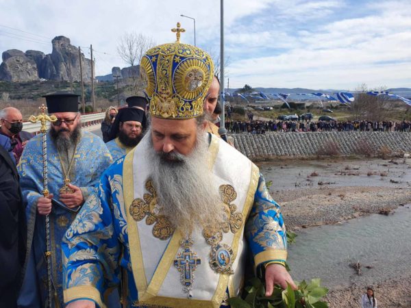 Μετά το πέρας της Θείας Λειτουργίας, ο Σεπτός μας Ποιμενάρχης μετέβη στον Πηνειό ποταμό, όπου τέλεσε την ακολουθία του Αγιασμού των Υδάτων και την ρίψη του Τιμίου Σταυρού στα νερά του θεσσαλικού ποταμού, ευλογώντας με αυτό τον τρόπο την περιφέρεια της Μητροπόλεώς του αλλά και ολόκληρο τον Νομό Τρικάλων και την Θεσσαλία, αφού ο Πηνειός ποταμός διασχίζει μεγάλο μέρος της.