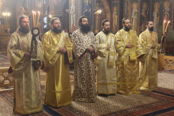 Της Θείας Λειτουργίας πορεξήρχε ο Σεβασμιώτατος Μητροπολιτης Σύρου κ. Δωρόθεος Β΄ και συνιερούργησαν οι Σεβασμιώτατοι Μητροπολίτες Μεσσηνίας κ. Χρυστόστομος, Άρτης κ. Καλλίνικος, Ιλίου κ. Αθηναγόρας, Τρίκκης κ. Χρυσόστομος, Λαρίσης κ. Ιερώνυμος, Πολυανής και Κιλκισίου κ. Βαρθολομαίος, ο άγων τα ονομαστήριά του επιχώριος Μητροπολίτης Σταγών και Μετεώρων κ. Θεόκλητος και ο Θεοφιλέστατος Επίσκοπος Αμφιπόλεως κ. Χρυσόστομος.
